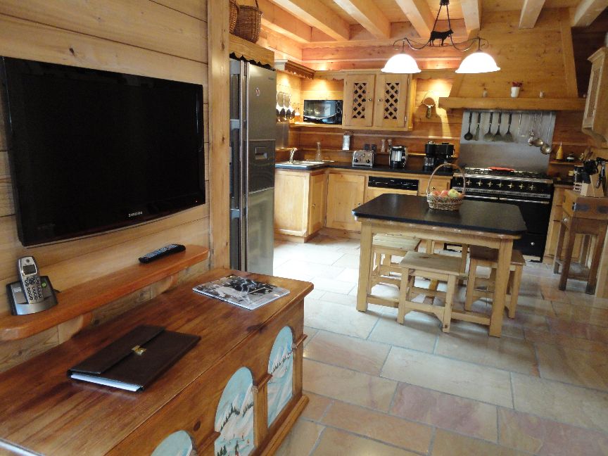 Cuisine équipée, grande pièce à vivre en cathédrale, salle à manger TV, salon cheminée TV.