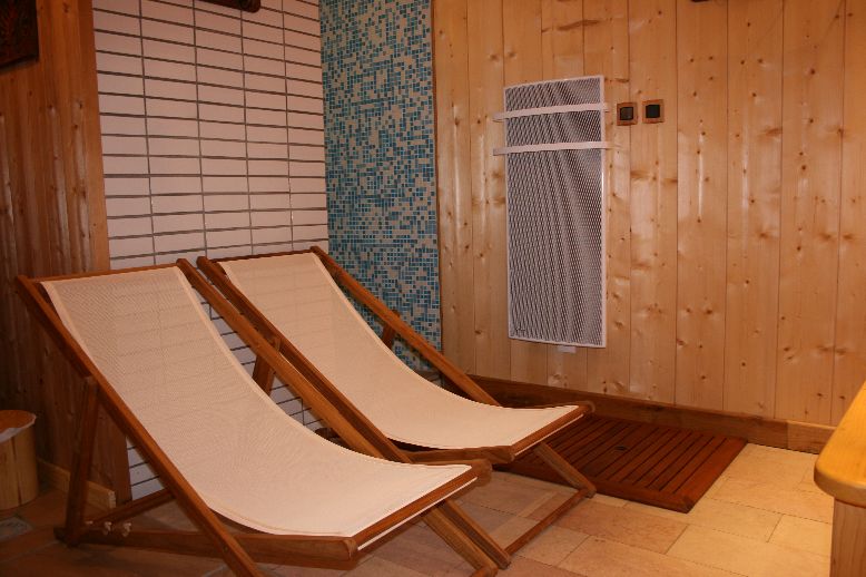 chaises longues de relaxation après sauna en luminothérapie et mini chaîne stéréo,